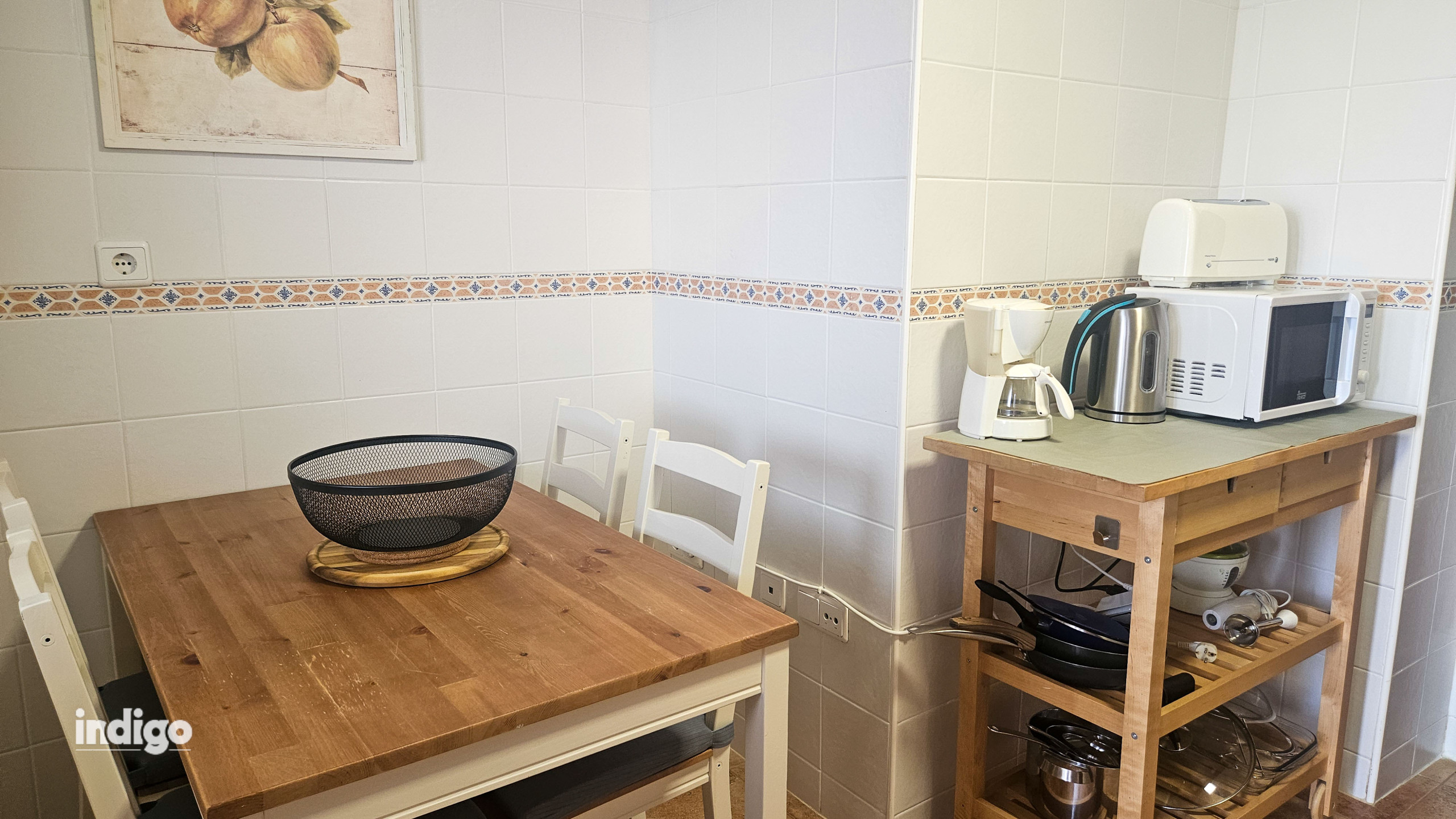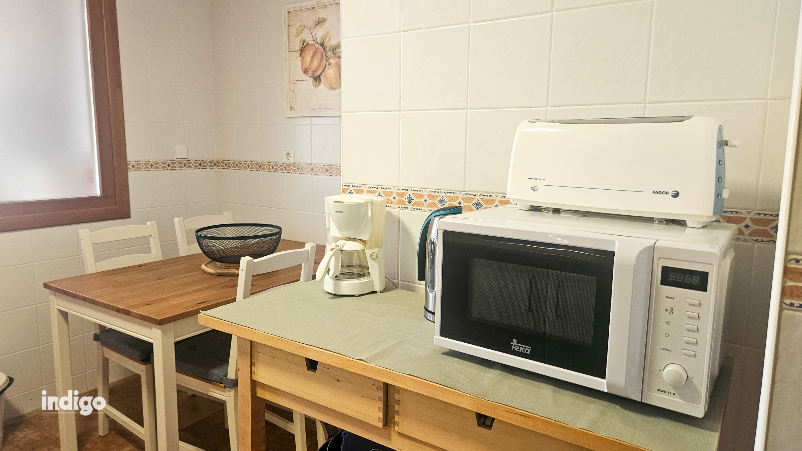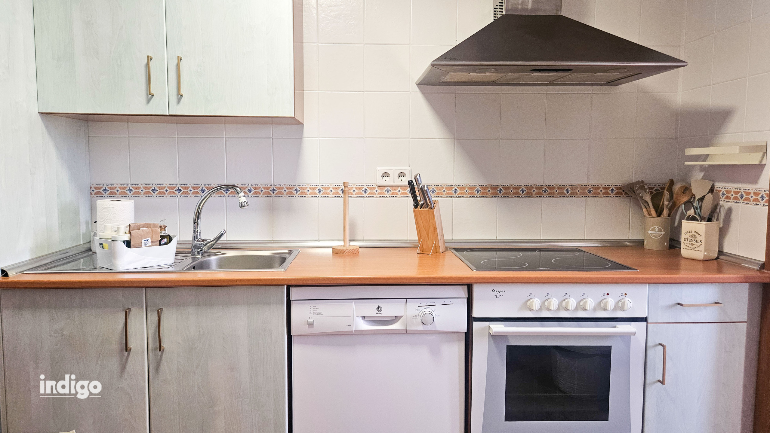 La cocina es un punto destacado, con electrodomésticos modernos como una placa vitrocerámica, frigorífico, lavadora, lavavajillas, horno, microondas, cafetera y un juego completo de utensilios de cocina. El entretenimiento está cubierto con una televisión por satélite que ofrece canales en español, y el WiFi gratuito te mantiene conectado.