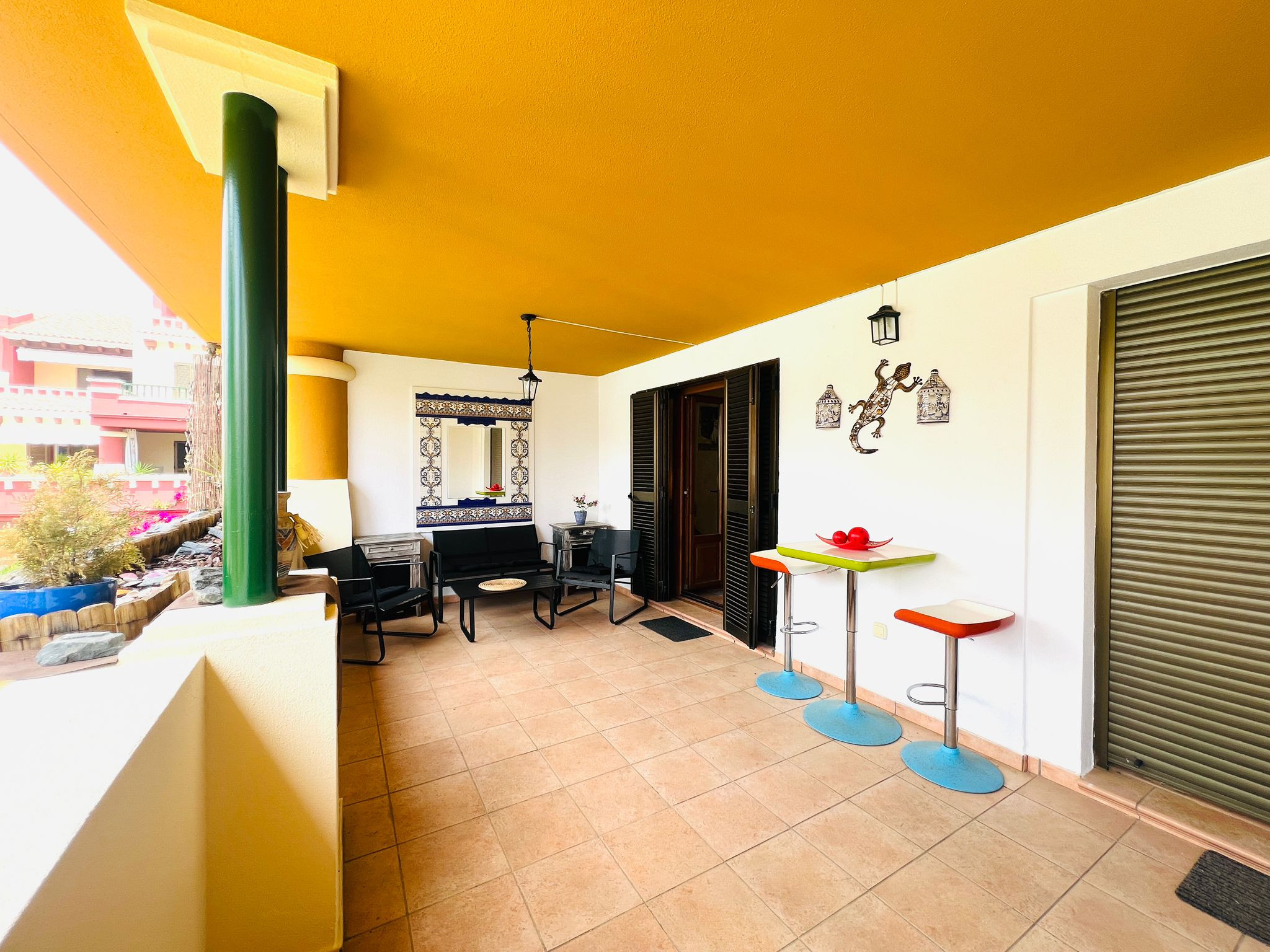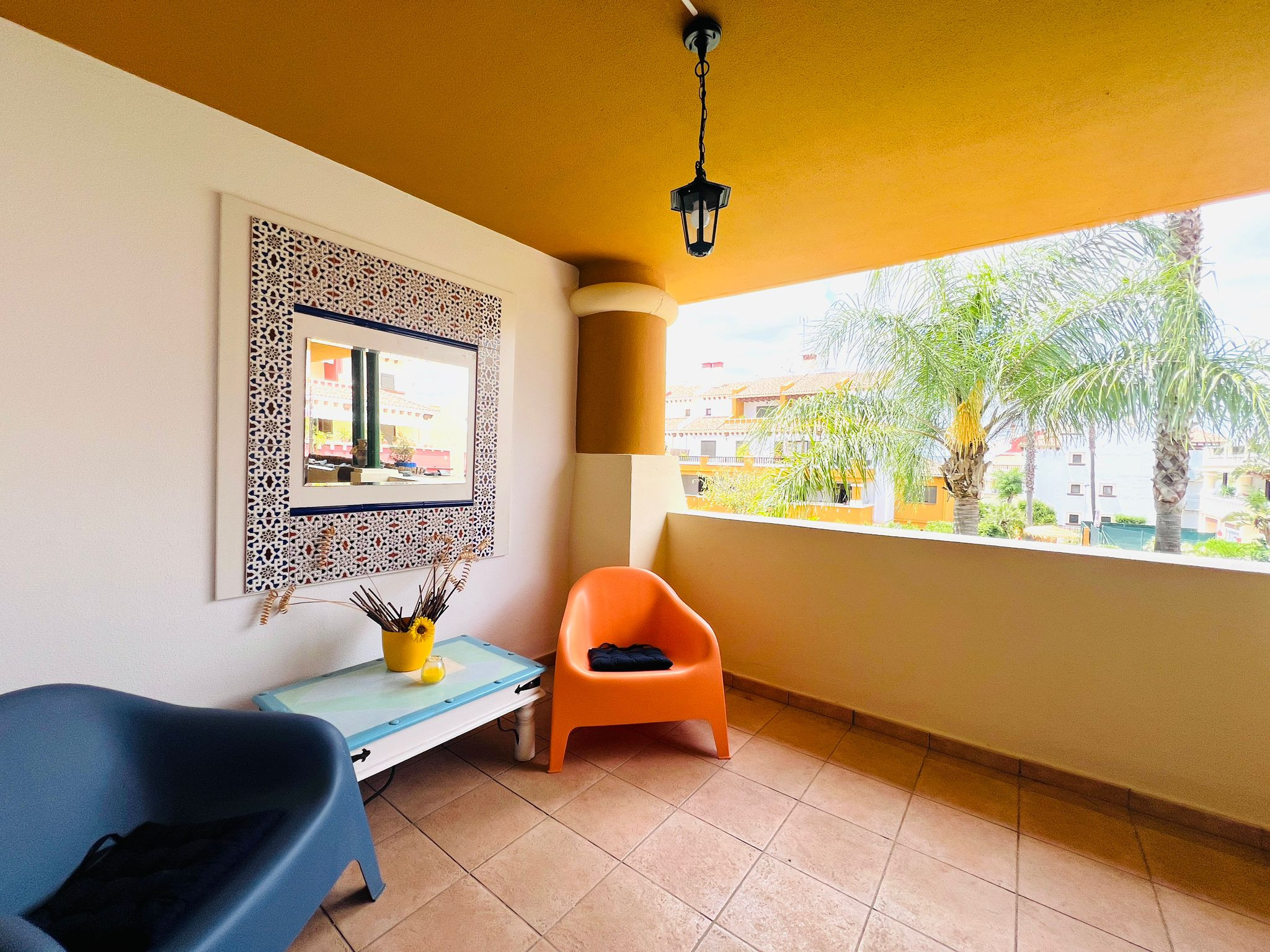 Dispõe de mobiliário de jardim, 24 m² de terraço, máquina de lavar roupa, ferro de engomar, acesso internet (wifi), aquecimento com radiadores eléctricos, ar-condicionado, piscina comunitária, estacionamento ao ar livre no mesmo edifício, 1 Televisão.